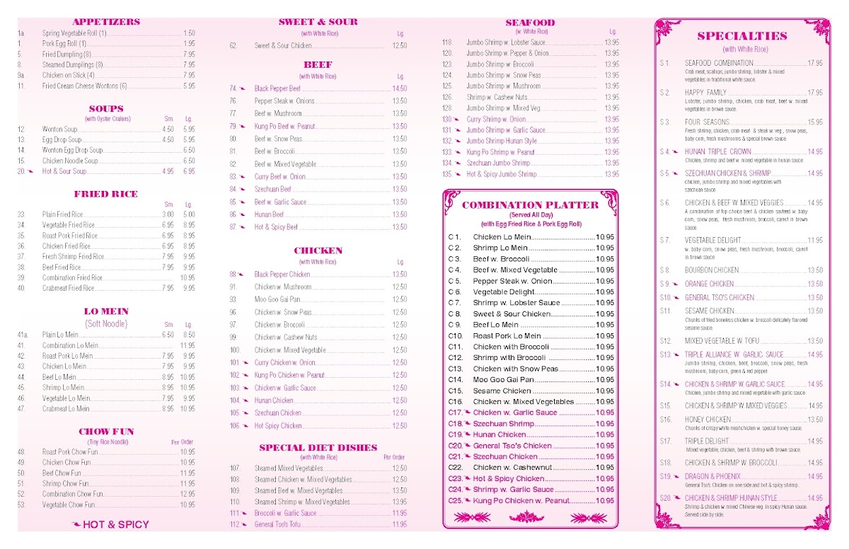 You’ll find a variety of comforting options like sweet & sour chicken, pepper steak with onions, and a range of beef dishes served with broccoli, mushrooms, or snow peas. Combination platters make it simple to try a balanced mix of flavors without fuss, and lunch specials provide a convenient, lighter way to enjoy familiar favorites during the busy midday hours.